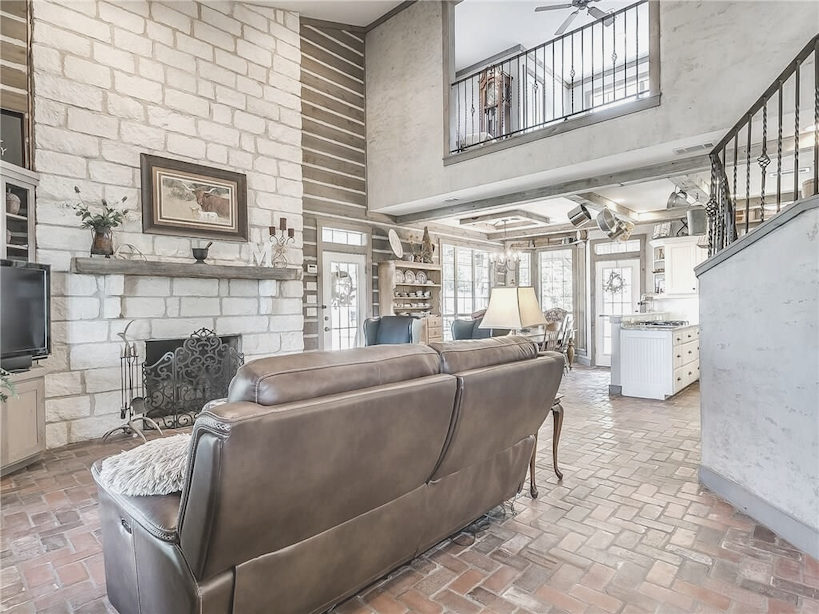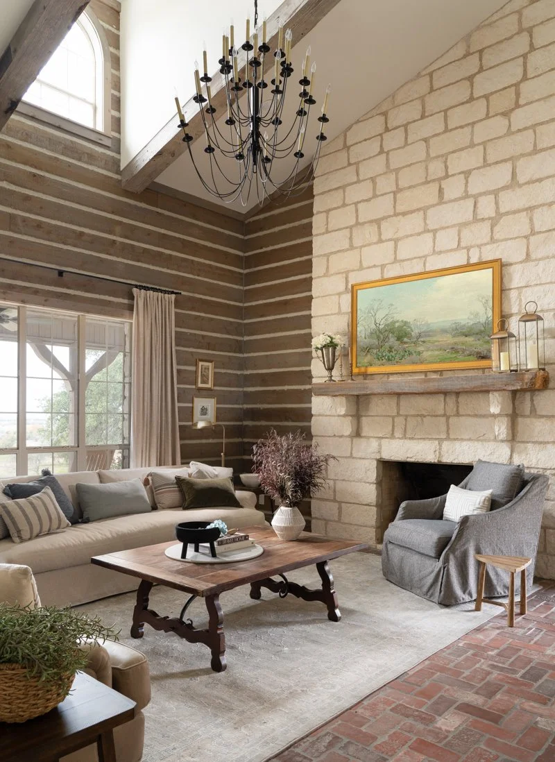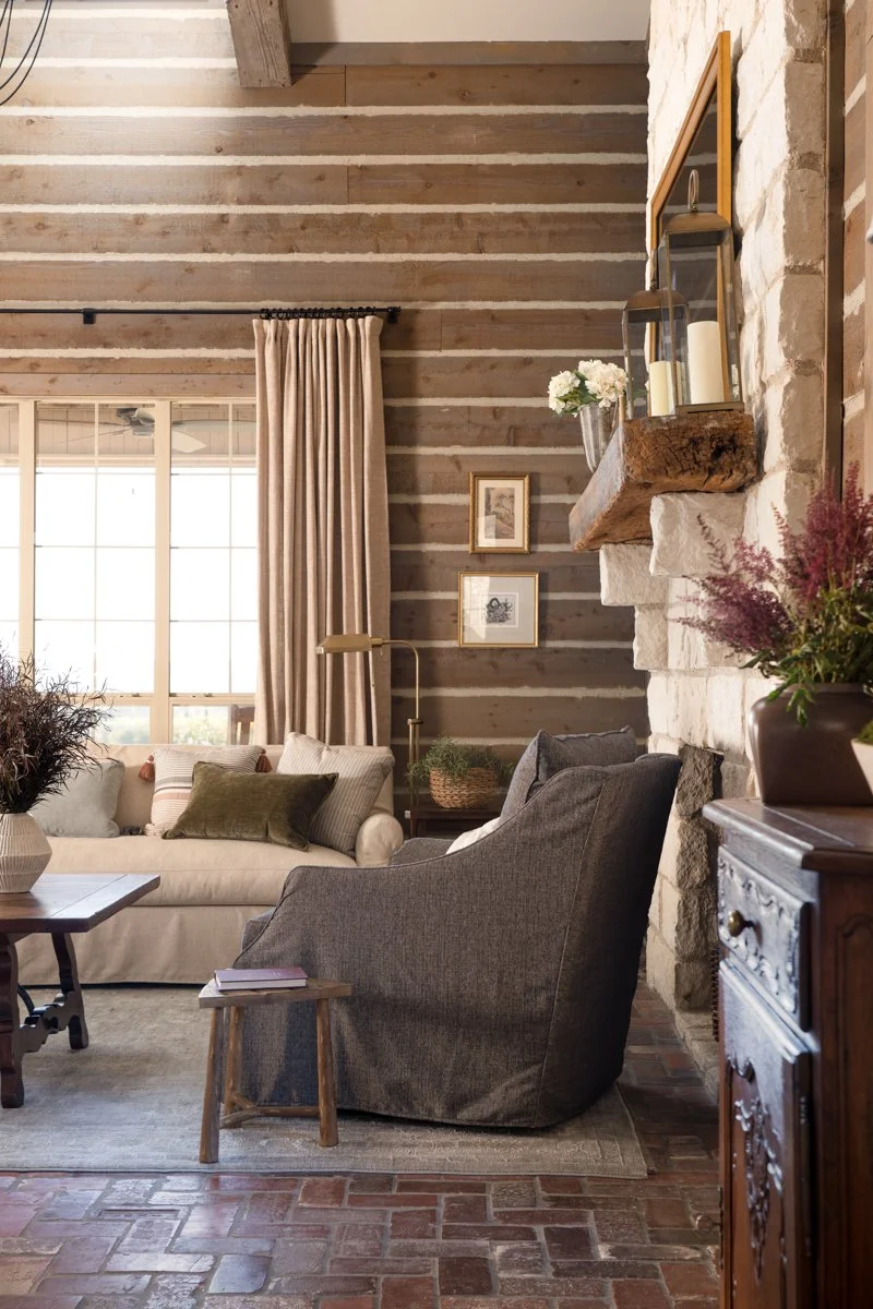 The home had a few great things going for it: incredible natural light, brick floors, a two-story limestone fireplace, and a beautiful - but uncommon - wood and plaster wall treatment.