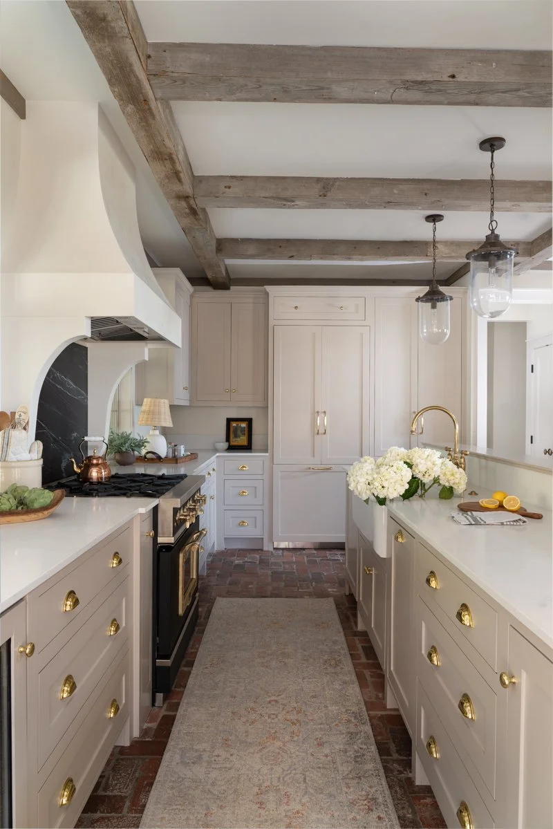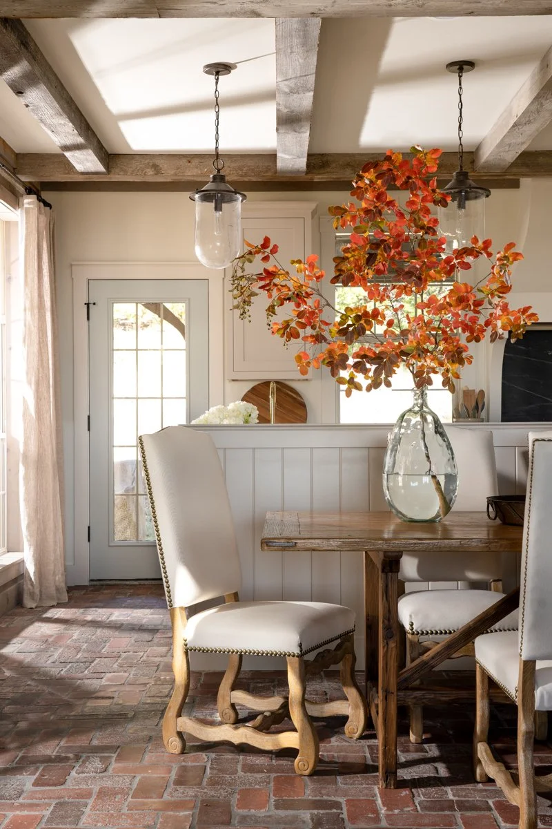 We salvaged & extended the original wood beams and brick floor but softened the palette by eliminating the textured walls and rustic wood trim.