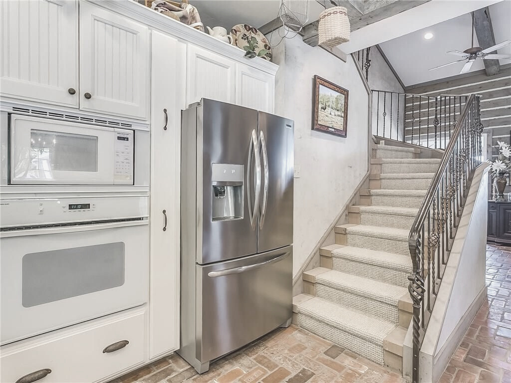 The carpeted stairs ended right at the foot of the refrigerator while also taking up a massive real estate in the living room.